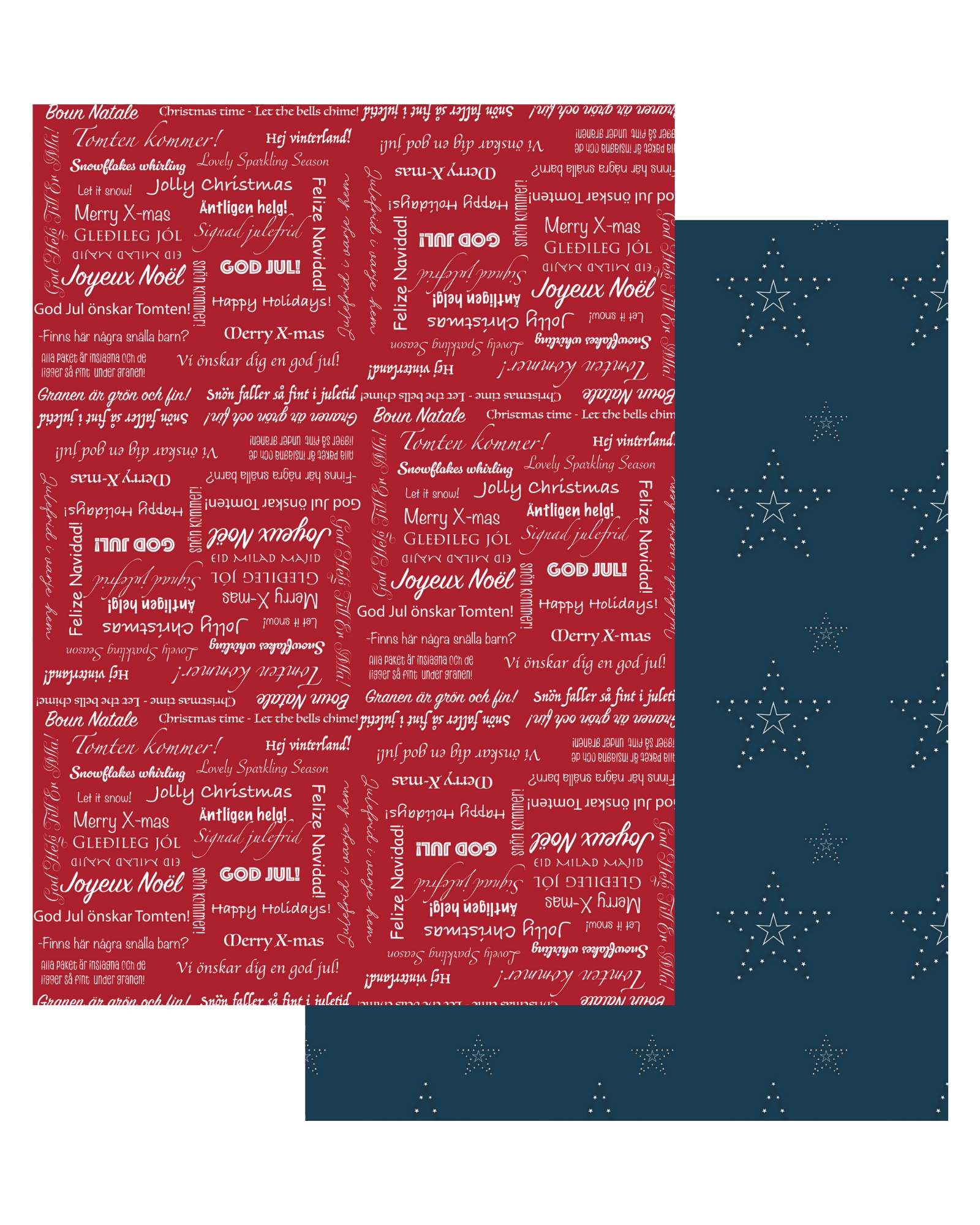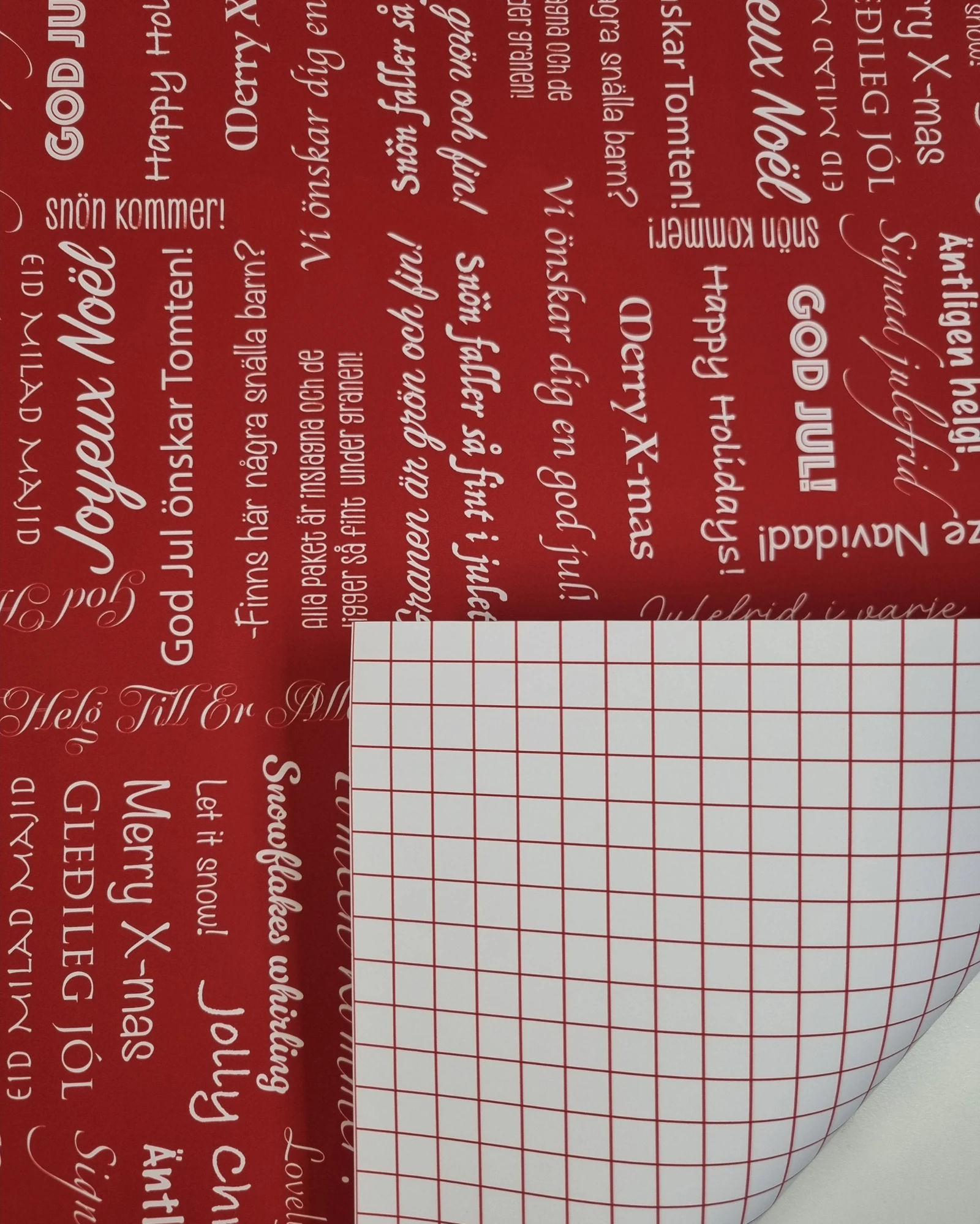 • Rött papper med “God Jul” på flera språk – ett varmt och inkluderande mönster med vit text på röd botten. En hyllning till den globala julglädjen.